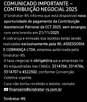 O SINDRATAR – RS – Sindicato das empresas prestadoras de serviços no segmento de refrigeração, aquecimento, climatização, e ventilação do Rio Grande do Sul é uma associação civil, sem fins lucrativos, com carta sindical datada de 02/01/2018, que visa congregar as empresas comerciais e de serviços que se dediquem às atividades econômicas representadas pelo segmento, assim como representar os interesses coletivos ou individuais de seus associados e celebrar Contratos Coletivos de Trabalho, Acordos e Convenções Coletivas com o escopo de regulamentar os aspectos trabalhistas atinente a atividade profissional e econômica de forma a regulamentar os custos de mão se obra do setor.